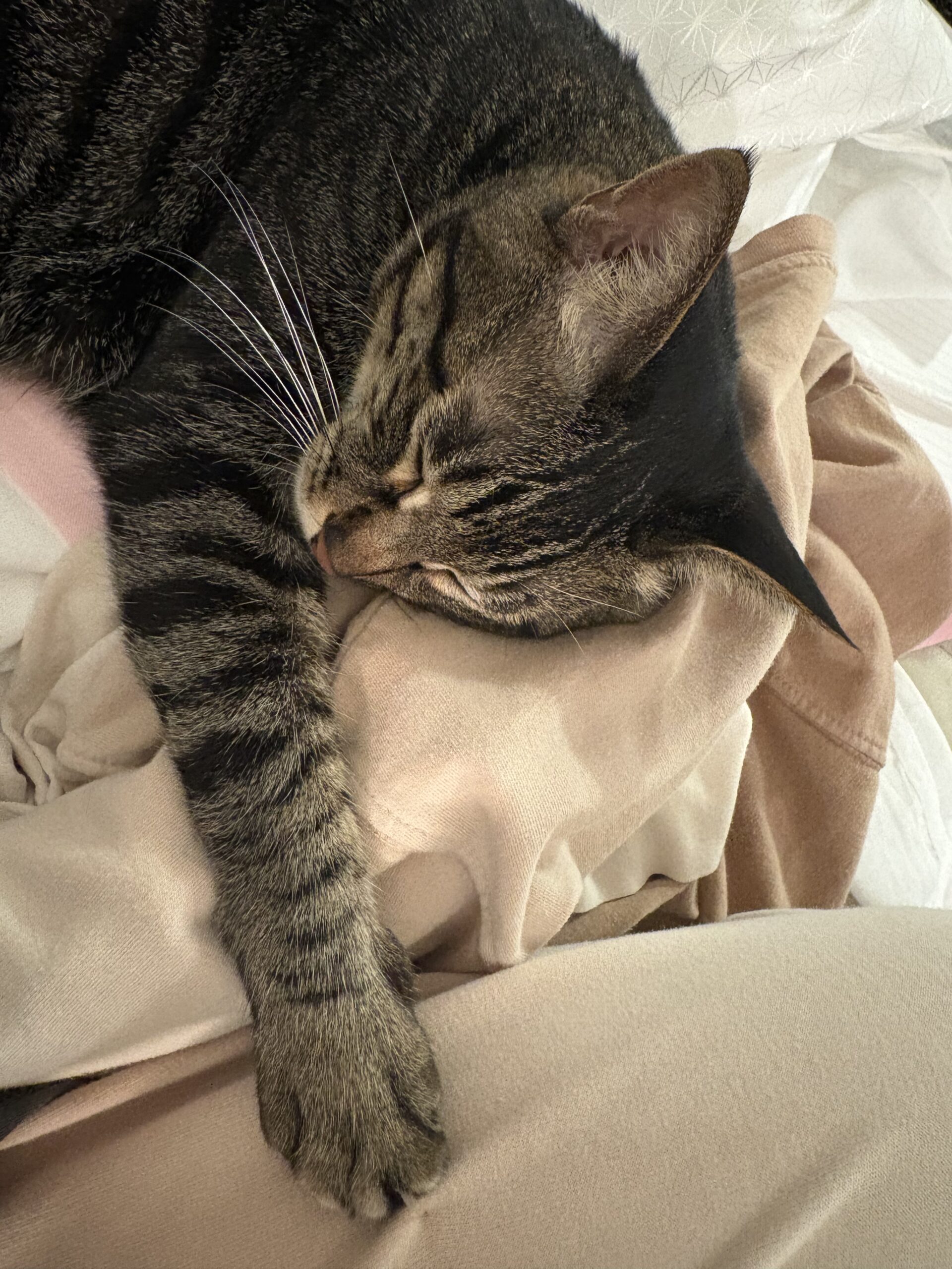 家に懐くと言われている猫ちゃんですが、みーちゃんは早くも新居に慣れて、今ではソファの上でくつろいでいます。写真は私の足にしがみついている何ともかわいい姿!