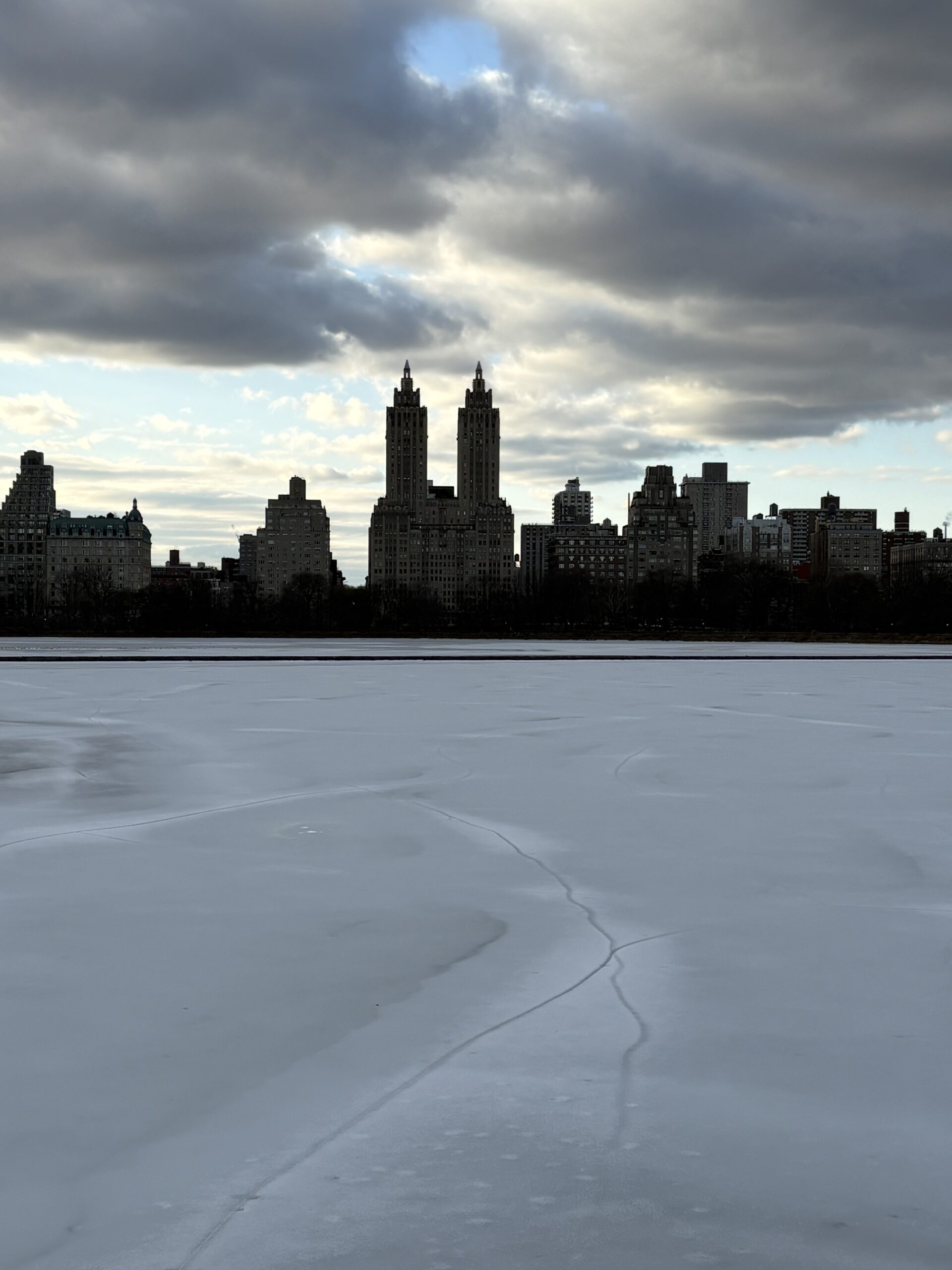 セントラルパークの貯水池。氷点下の日々からようやく抜け出したものの、長引いた氷点下の影響で分厚い氷の状態に。