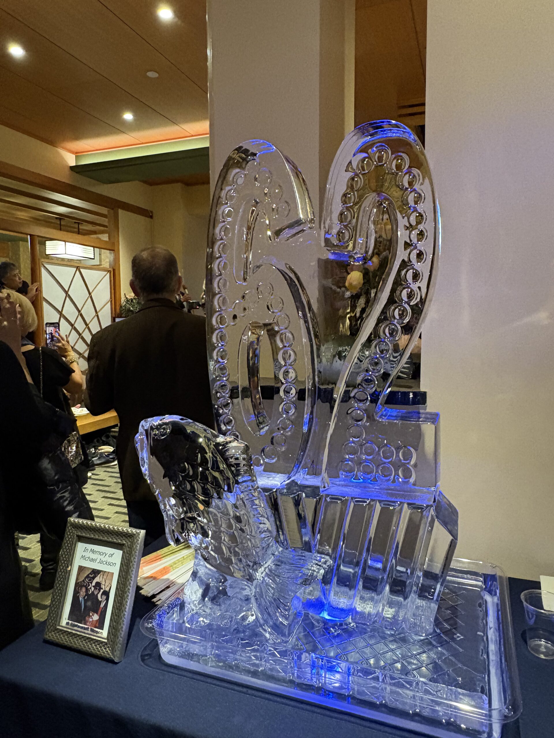 当日は、氷の彫刻制作で著名な岡本慎太郎さんのスタジオから、こんなに見事なサプライズギフトをいただき、ゲストたちの写真撮影スポットとなりました。氷の左の写真は、マイケルジャクソンと倉岡ご夫妻