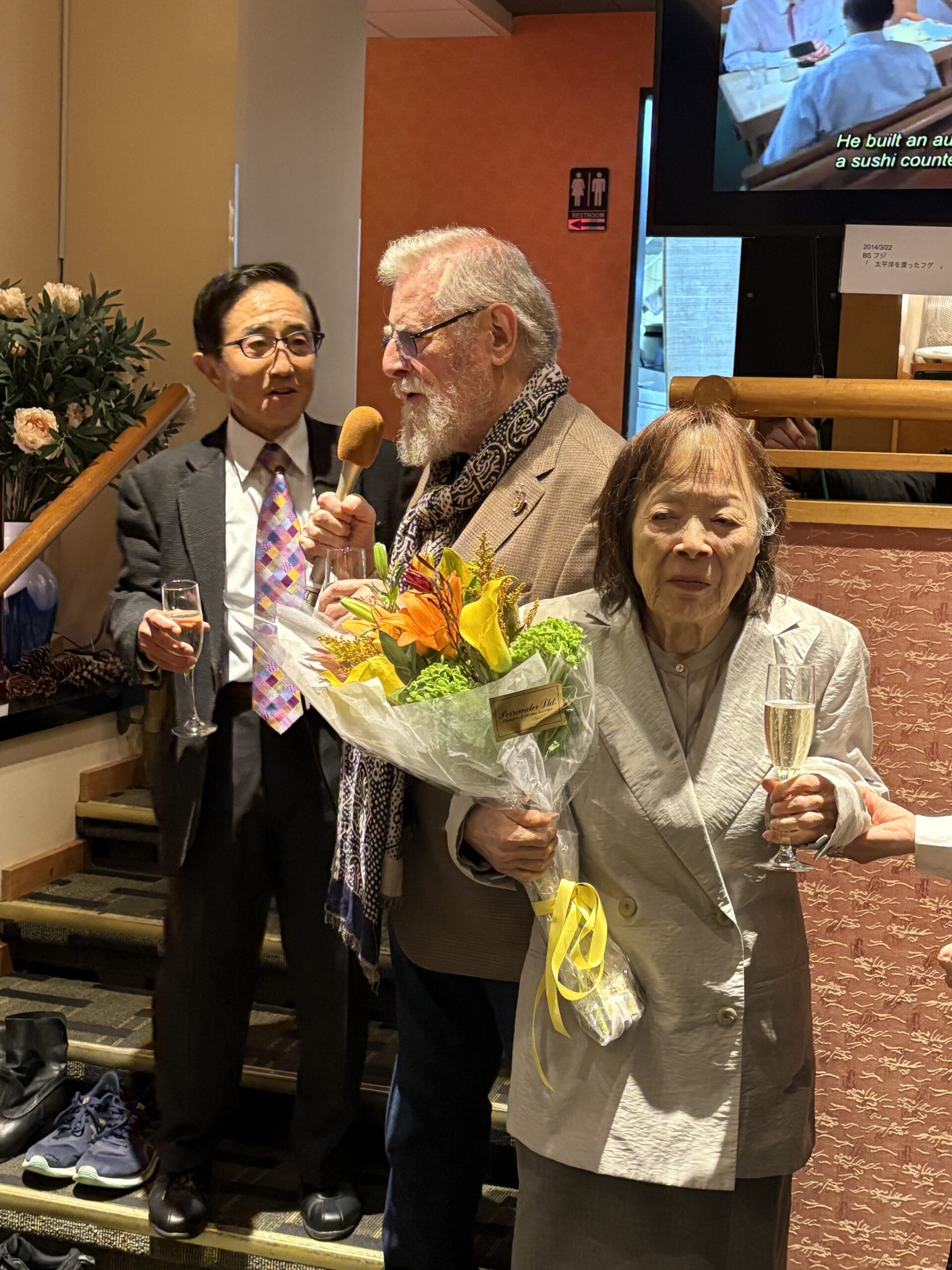 馬越さんの挨拶の時には、レストラン日本の長年の常連さんである、日本を代表するジャズピアニストの秋吉敏子さんと旦那様のルータバキンさんも、駆け付けてくれました。奇しくもこの日はお二人の結婚記念日で、そのお祝いもできました